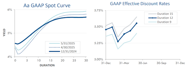 Pension liabilities (for funding, accounting, and de-risking purposes) are driven by market interest rates. The first graph below compares our Aa GAAP spot yield curve at December 31, 2024 and May 31, 2025 (along with the movement in the curve last month). The second graph below shows our estimate of movements in effective GAAP discount rates for pension obligations of various duration during 2025: