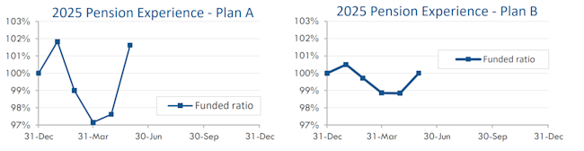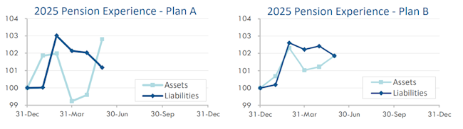 Pensions roared back in May on the strength of higher stock markets and higher interest rates. Both model plans we track[1] gained ground last month: traditional Plan A gained 4%, ending the month up more than 1% for the year, while the more conservative Plan B gained 1% last month, ending the month even through the first five months of 2025: