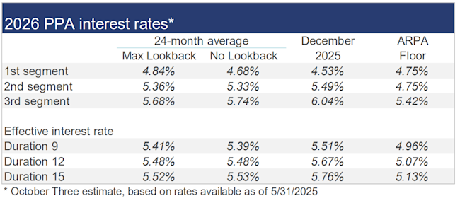 The table below summarizes rates that calendar-year plan sponsors are required to use for IRS funding purposes for 2025, along with estimates for 2026, including the rate “floor” that applies to the 24-month average rates under funding relief for each segment.