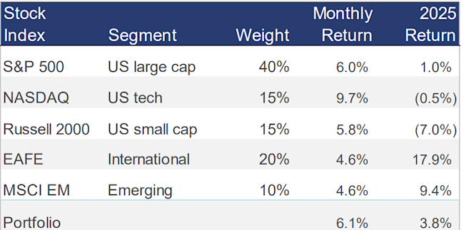 Stocks rose strongly across the board last month, gaining 6% and ending the month up almost 4% for the year through May:
