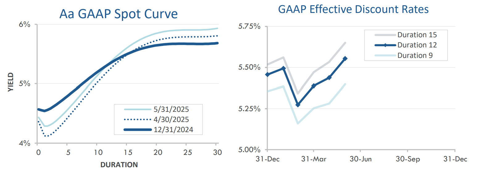 Pension liabilities (for funding, accounting, and de-risking purposes) are driven by market interest rates. The first graph below compares our Aa GAAP spot yield curve at December 31, 2024 and May 31, 2025 (along with the movement in the curve last month). The second graph below shows our estimate of movements in effective GAAP discount rates for pension obligations of various duration during 2025: