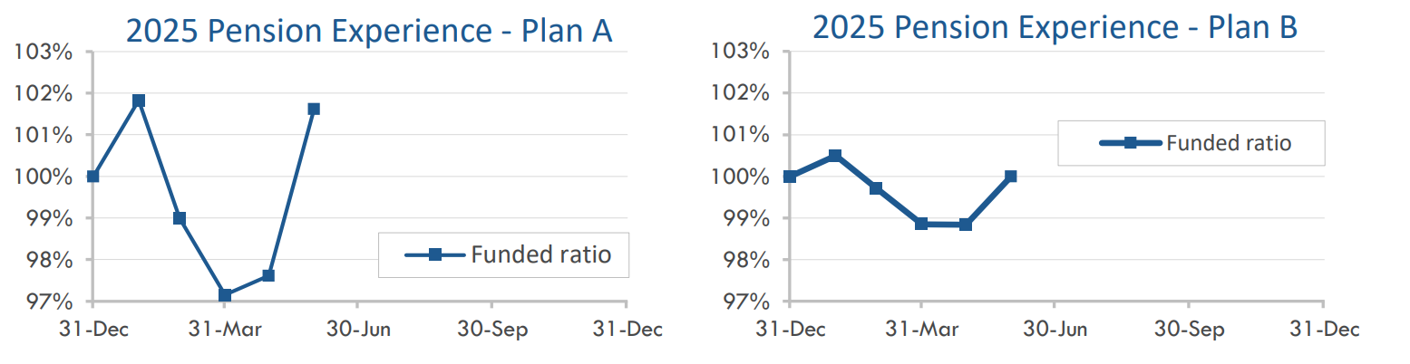 Long-term corporate bond yields rose 0.12% during May. As a result, pension liabilities fell by about 1% last month but remain up 1%-2% through the first five months of 2025.