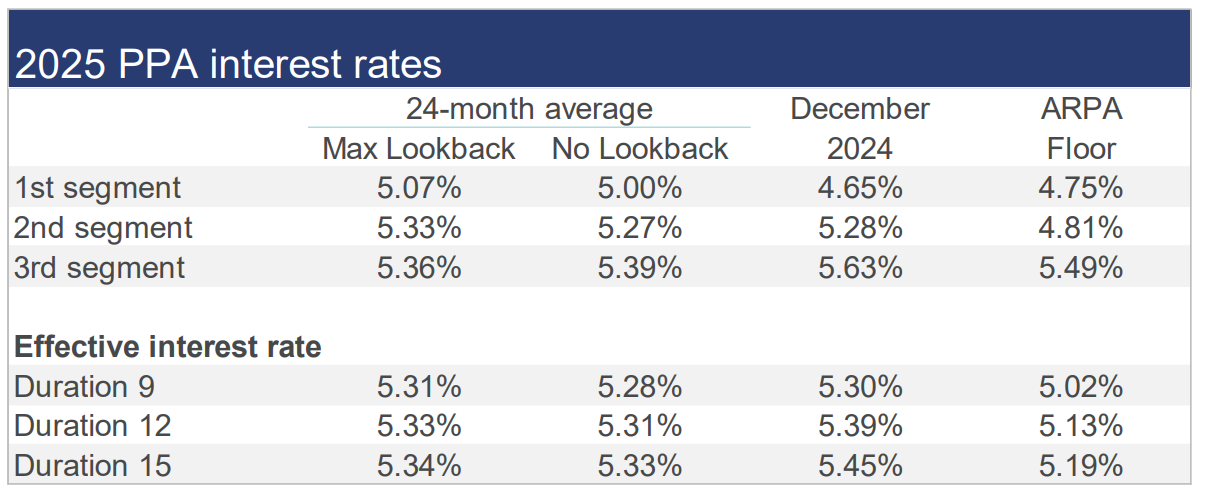 Sustained higher interest rates since late 2022 have substantially diminished the impact of pension funding relief since 2023. Underfunded plans are likely seeing higher required contributions for the next few years.