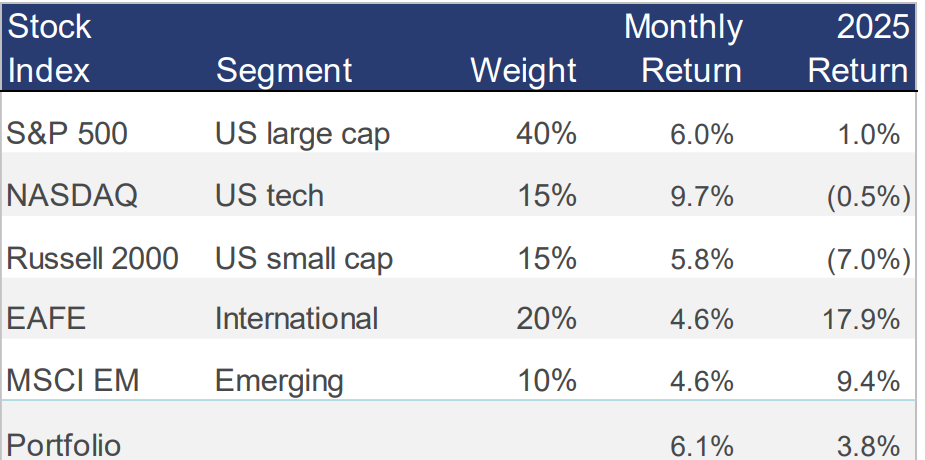 Stocks rose strongly across the board last month, gaining 6% and ending the month up almost 4% for the year through May:
