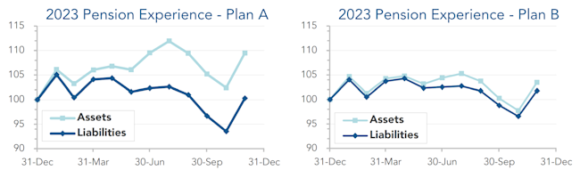 With one month to go, 2023 is shaping up to be another solid year for pension finance, driven by higher interest rates and higher stock markets. The graphs below illustrate the path of assets and liabilities for our two model plans through the first eleven months of 2023: