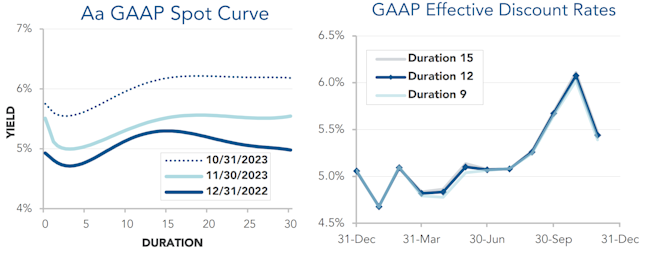 Pension liabilities (for funding, accounting, and de-risking purposes) are driven by market interest rates. The first graph below compares our Aa GAAP spot yield curve at December 31, 2022 and November 30, 2023, and it also shows the sharp drop in rates last month. The second graph below shows our estimate of movements in effective GAAP discount rates for pension obligations of various duration so far this year: