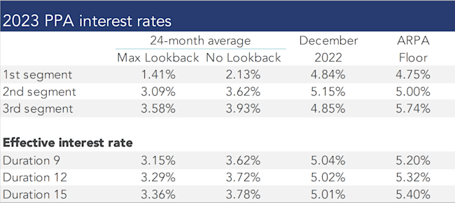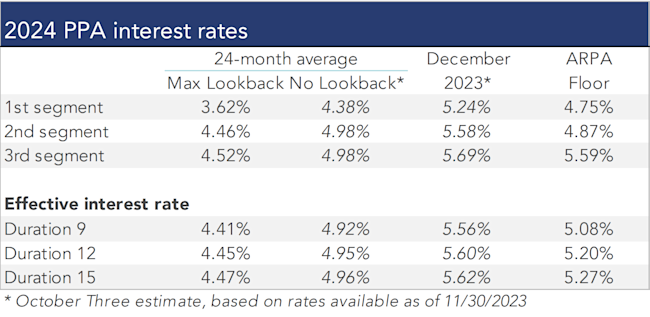 The table below summarizes rates that plan sponsors are required to use for IRS funding purposes for 2023, along with estimates for 2024. Pre-relief, both 24-month averages and December ‘spot’ rates, which are still required for some calculations, such as PBGC premiums, are also included.