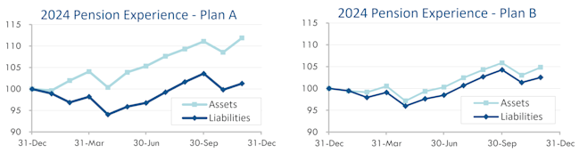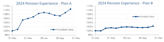 Strong US stock market returns propelled pension finances to a new 2024 high-water mark in November. Both model plans we track[1] gained ground last month: Plan A improved more than 1% last month and is now up 10% this year through November, while Plan B gained a fraction of 1% and is now up 2% through the first eleven months of 2024: