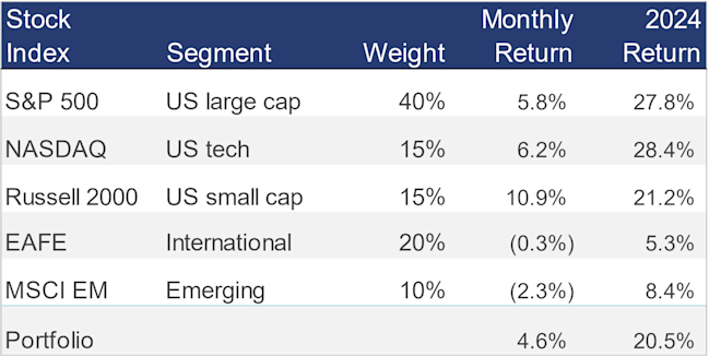US stocks had another strong month during November. A diversified stock portfolio gained more than 4% last month and is now up 20% for the year through November, with US stocks leading the way: