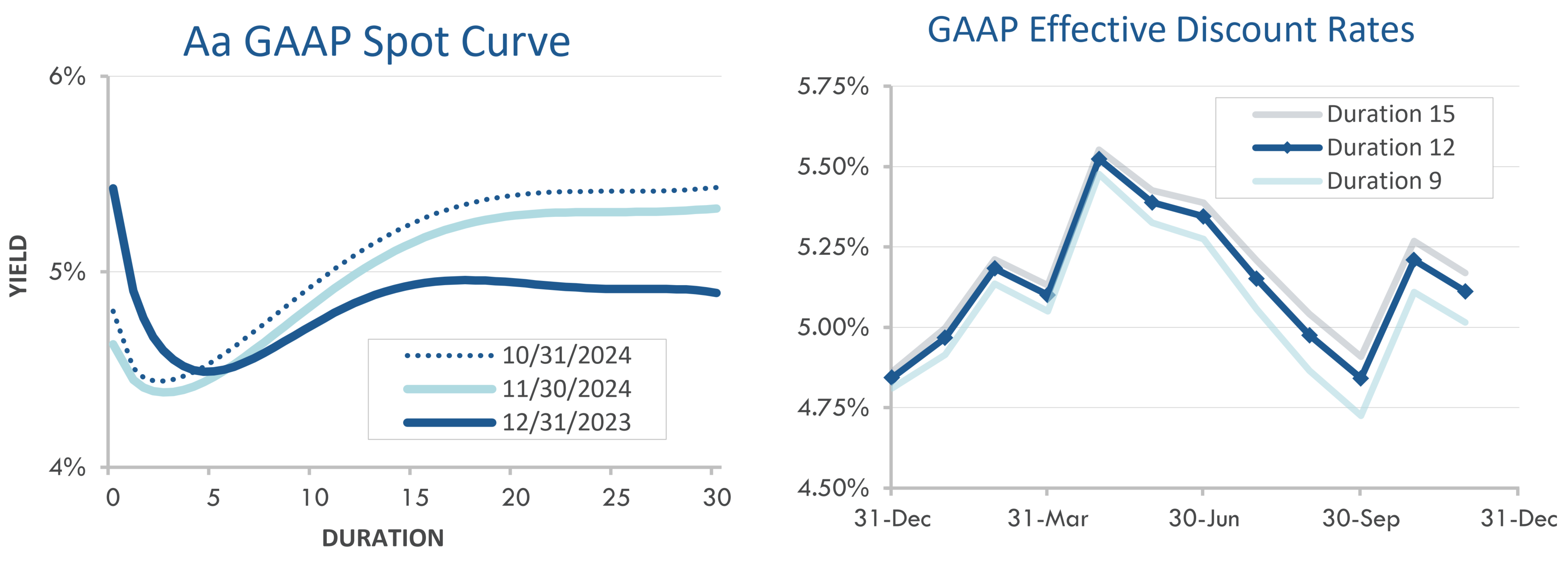 Pension liabilities (for funding, accounting, and de-risking purposes) are driven by market interest rates. The first graph below compares our Aa GAAP spot yield curve at December 31, 2023 and November 30, 2024 (along with the movement in the curve last month). The second graph below shows our estimate of movements in effective GAAP discount rates for pension obligations of various duration during 2024:
