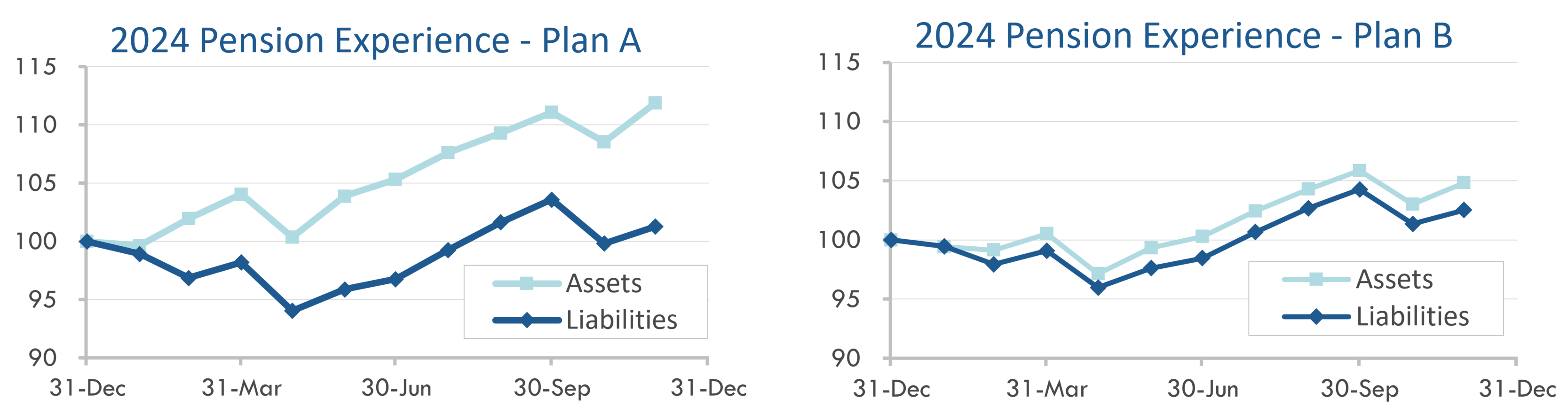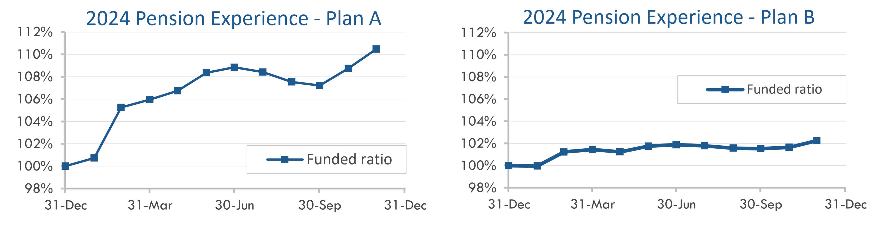 Strong US stock market returns propelled pension finances to a new 2024 high-water mark in November. Both model plans we track[1] gained ground last month: Plan A improved more than 1% last month and is now up 10% this year through November, while Plan B gained a fraction of 1% and is now up 2% through the first eleven months of 2024: