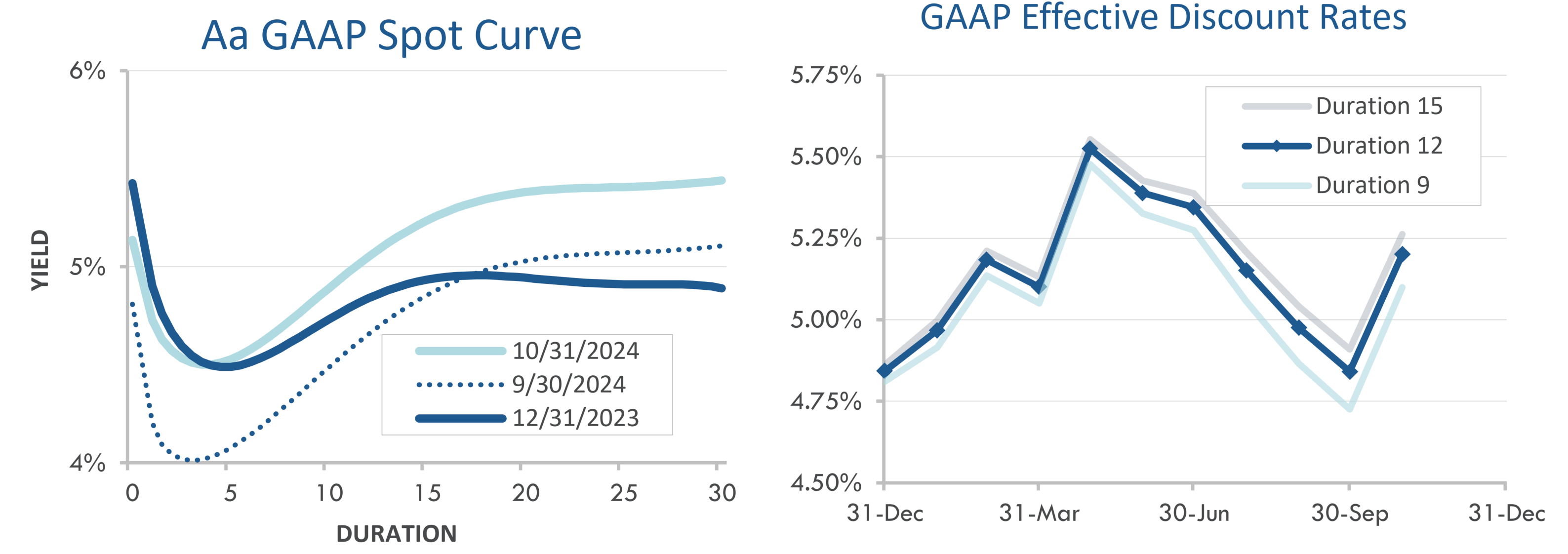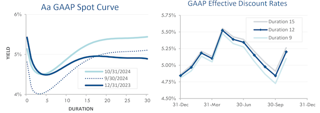 Pension liabilities (for funding, accounting, and de-risking purposes) are driven by market interest rates. The first graph below compares our Aa GAAP spot yield curve at December 31, 2023 and October 31, 2024 (along with the movement in the curve last month). The second graph below shows our estimate of movements in effective GAAP discount rates for pension obligations of various duration during 2024: