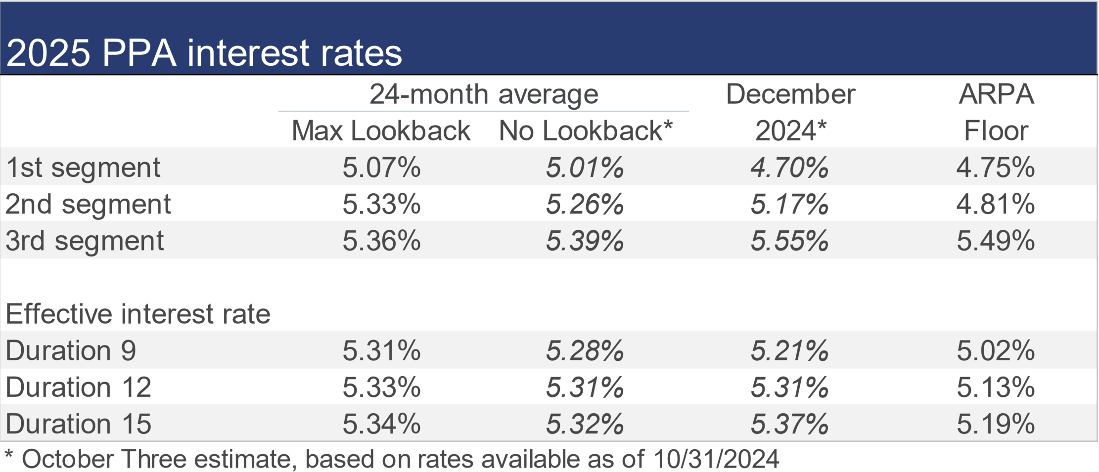 The table below summarizes rates that calendar-year plan sponsors are required to use for IRS funding purposes for 2024, along with estimates for 2025. Pre-relief, both 24-month averages and December ‘spot’ rates, are also included.