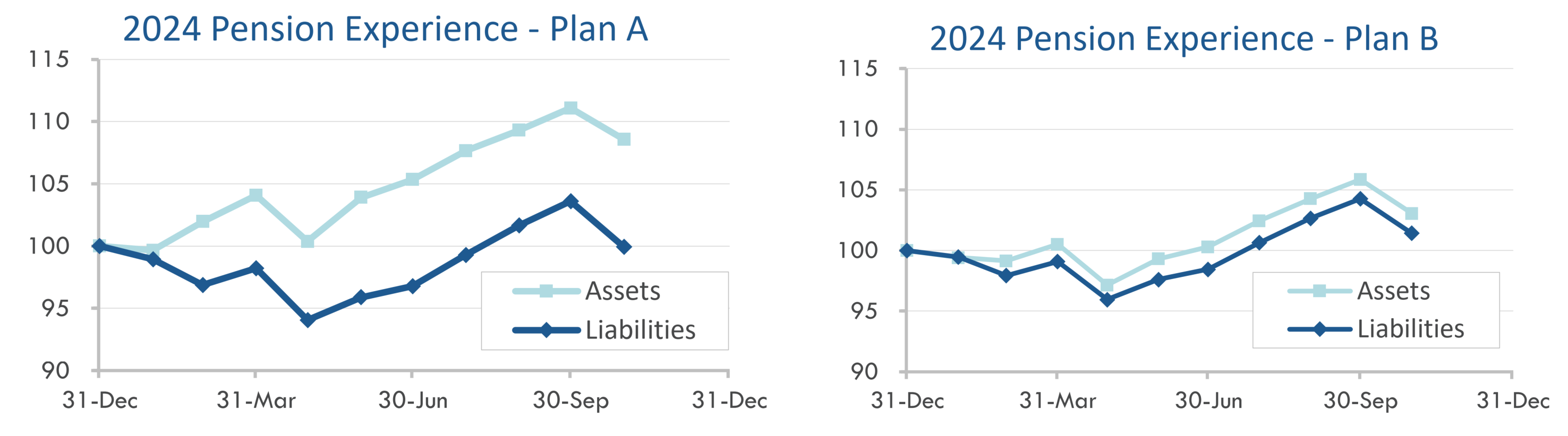 Despite the October pullback, stocks are on track for another strong year. At the same time, long-term interest rates have moved higher, confounding expectations and providing a tailwind for pension finances. As a result, most pension sponsors are seeing improved funded ratios this year. The graphs below show the movement of assets and liabilities during the first ten months of 2024: