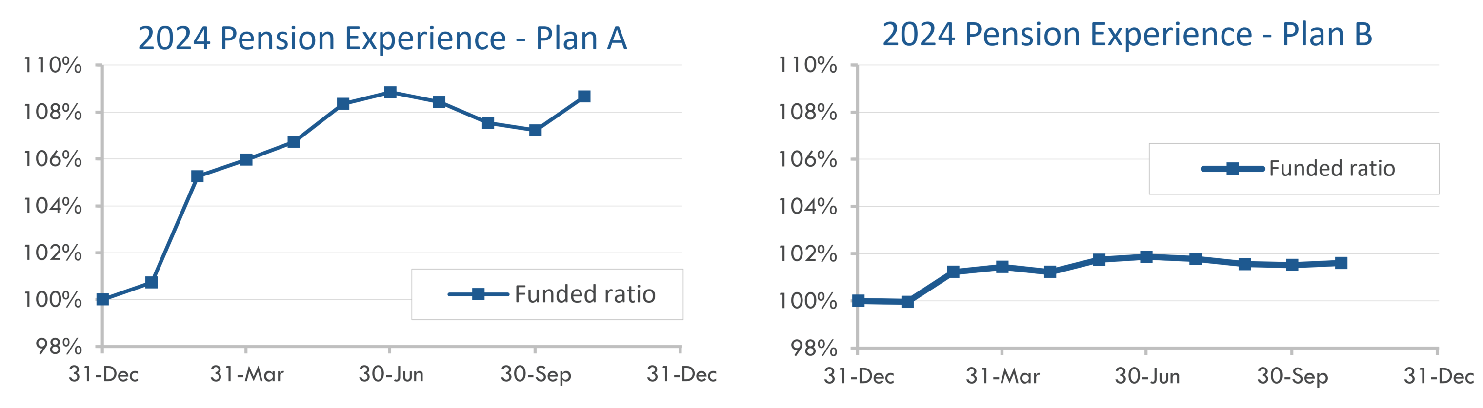 Pension sponsors saw modest improvement in funded status last month, as higher interest rates more than offset lower stock prices. Both model plans we track[1] gained ground last month: Plan A improved more than 1% last month and remains up more than 8% this year through October, while Plan B gained a fraction of 1% and remains up more than 1% through the first ten months of 2024:
