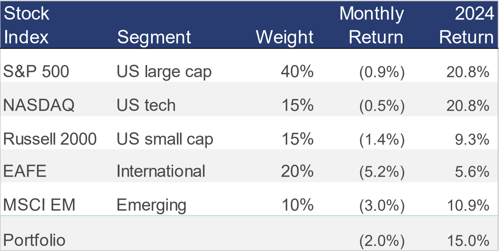 Stocks lost ground during October. A diversified stock portfolio lost 2% last month but is still up 15% for the year through October, with US large cap and tech stocks leading the way: