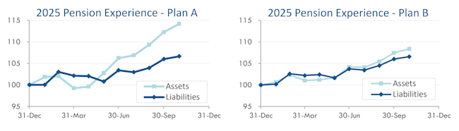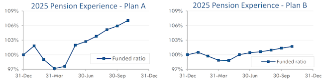 October was the seventh consecutive month of positive news for pension finances this year, driven by continued stock market strength. Both model plans we track[1] gained ground last month: traditional Plan A gained 1%, ending the month up almost 7% for the year, while the more conservative Plan B gained a fraction of 1% last month, ending the month up almost 2% through the first ten months of 2025: