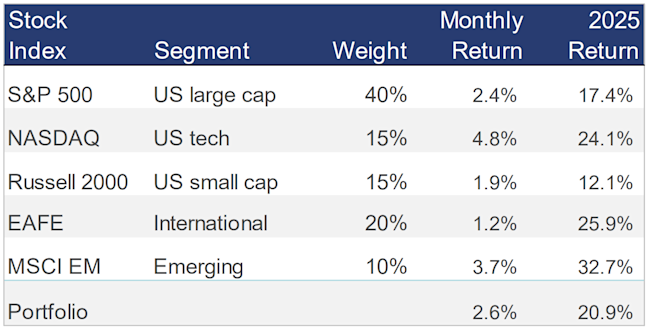 Overall, our traditional 60/40 portfolio gained almost 2% last month and is now up 14% so far this year, while the conservative 20/80 portfolio also gained 1% last month and is now up more than 8% through the first ten months of 2025.