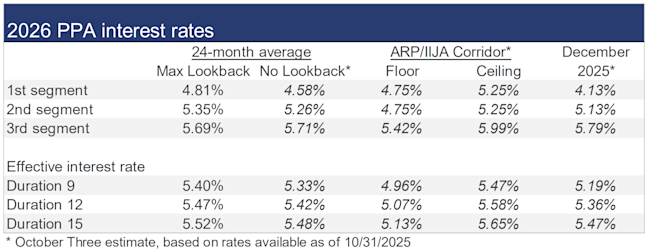 The table below summarizes rates that calendar-year plan sponsors are required to use for IRS funding purposes for 2025, along with estimates for 2026, including the rate “corridor” that applies to the 24-month average rates under funding relief for each segment.