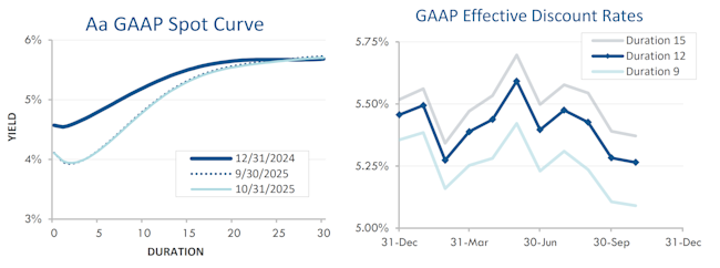 Pension liabilities (for funding, accounting, and de-risking purposes) are driven by market interest rates. The first graph below compares our Aa GAAP spot yield curve at December 31, 2024 and October 31, 2025 (along with the movement in the curve last month). The second graph below shows our estimate of movements in effective GAAP discount rates for pension obligations of various duration during 2025: