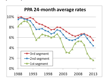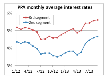 The next chart shows interest rates for 2012-2013 – the period MAP-21 has been in effect – looking at the monthly average for the key PPA second- and third-segment rates: