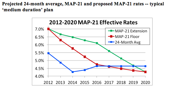 Lawmakers in Washington have a budget problem, and a small part of the solution being considered is, as we understand it, an extension of interest rate stabilization relief under 2012’s “Moving Ahead for Progress in the 21st Century Act” (MAP-21). The proposal is to extend the MAP-21 25-year average floor at the 90% level through 2016.