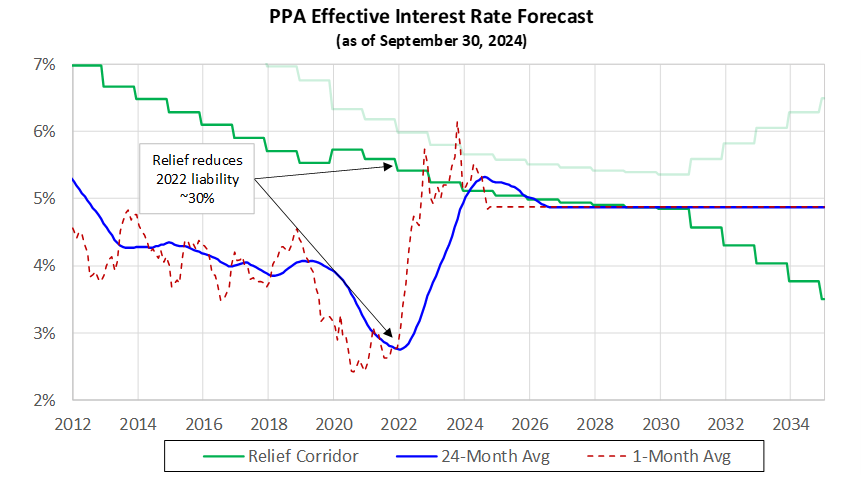 The chart below shows the path of effective interest rates for a typical plan using 1-month average (“market”) rates, 24-month average rates, and the funding relief 25-year average “floor” on rates. During 2012-2022, funding relief (the 25-year average floor – the green line) allowed sponsors to use interest rates consistently 200+ basis points above market rates, understating liabilities by 30% for a typical plan, substantially reducing required contributions and increasing FTAP/AFTAPs.