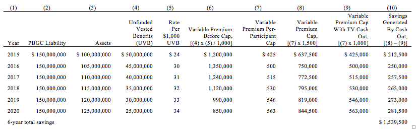 If we compare column (6) to column (8) in the above example, we see that the variable premium cap is expected to apply to this plan through 2020. Note that this is only because the plan is significantly underfunded ($50 million). If assets were $125 million, the cap would not apply in any of these years. Clearly, the larger the plan’s unfunded liability, the more likely the variable premium cap is to come into play.