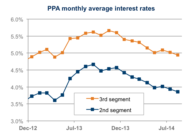 The chart below shows the movement of long-term interest rates since December 2012, based on changes in the ‘PPA segment rates’ which are used for pension lump sum calculations: