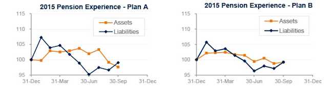 Interest rates fell about 0.1% during September and corporate bond yields are now about 0.25% higher than at the end of 2014 (Treasuries have risen about 0.10% this year, so credit spreads have increased 0.15% during 2015.) Last month’s move pushed pension liabilities up 2%-3% leaving them flat to down 1% compared with December 31, 2014, with long duration plans seeing the biggest decreases.