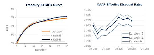 Both funding and accounting liabilities are now driven by market interest rates. The graph on the left compares Treasury STRIPs yields at December 31, 2014, and September 30, 2015, and also shows the movement in rates last month. The graph on the right shows our estimate of movements in effective GAAP discount rates for pension obligations of various duration during 2015 so far: