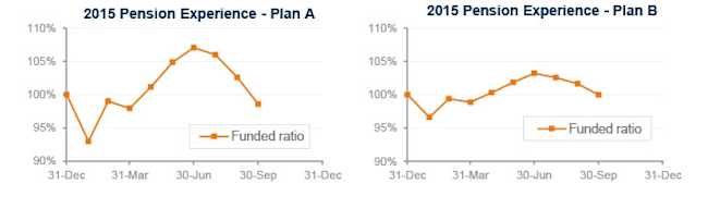 After topping out in June, pension sponsors have seen three straight months of declining pension funded status – driven be declining stock prices and interest rates – and are now modestly underwater through the first three quarters of 2015: