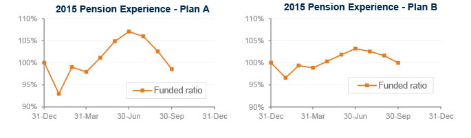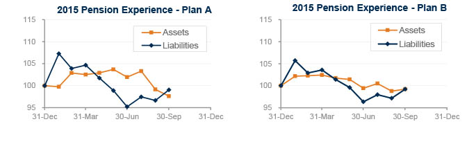 September was a rough month for pension sponsors, capping a rough third quarter of 2015. Declining stock markets and lower interest rates hurt pension plans last month, eliminating gains from earlier this year for both model pension plans we track1. Plan A lost 4% during September and is now down almost 2% for the year, while Plan B dropped 2% last month and is now basically even for the year through September.