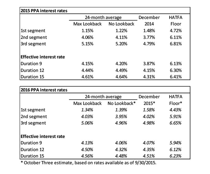 The table below summarizes rates that plan sponsors are required to use for IRS funding purposes for 2015, along with estimates for 2016. Pre-HATFA, both 24-month averages and December ‘spot’ rates, which are still required for some calculations, such as PBGC premiums, are also included.