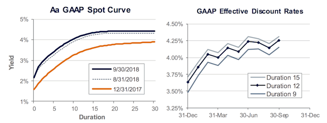 Pension liabilities (for funding, accounting, and de-risking purposes) are now driven by market interest rates. The graph on the left compares our Aa GAAP spot yield curve at December 31, 2017, and September 30, 2018, and it also shows the movement in the curve last month. The graph on the right shows our estimate of movements in effective GAAP discount rates for pension obligations of various duration during 2018: