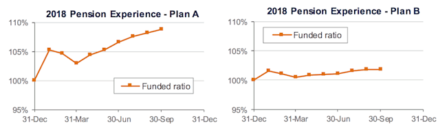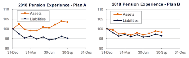 2018 has been a year of grinding improvement for pension sponsors. The ability of stocks to maintain valuations and even continue to rise in the face of increasing interest rates has quietly produced significant improvement in pension finance in the first three quarters of 2018.The graphs below show the movement of assets and liabilities for our two model plans so far this year:
