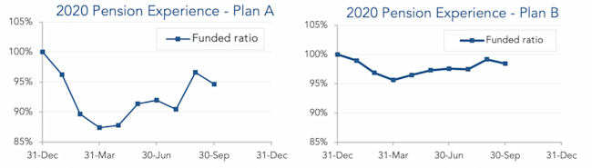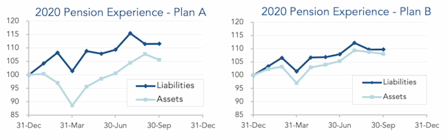 Capital market volatility and credit spreads have normalized in recent months after a wild ride earlier this year. As the dust has settled, 2020 is looking like a negative year for pension sponsors due to all-time low interest rates pushing liabilities ever higher. The graphs below show the movement of assets and liabilities for our two model plans during the first three quarters of the year: