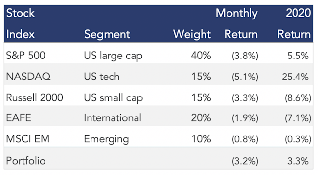 Overall, our traditional 60/40 portfolio lost 2% in September but remains up more than 5% for the year, while the conservative 20/80 lost 1% last month but remains up 8% through the first three quarters of 2020.