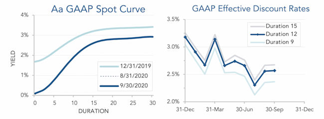 Pension liabilities (for funding, accounting, and de-risking purposes) are driven by market interest rates. The first graph below compares our Aa GAAP spot yield curve at December 31, 2019 and September 30, 2020, and it also shows the (tiny) increase in the curve last month. The second graph below shows our estimate of movements in effective GAAP discount rates for pension obligations of various duration during 2020: