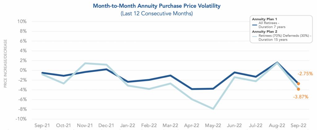 Annuity purchase cost can alter from month to month. Although the annuity purchase cost for both plans increased last month, we have seen a general downward trend in cost in 2022. Since last month, The purchase price for Annuity Plan 1 decreased 2.75% and Annuity Plan 2 decreased 3.87%. An early entrance to the insurance market is a vital component of the planning stage because of the consistent short-term volatility of annuity pricing. By connecting with an annuity search firm early on, plan sponsors can capitalize on favorable fluctuations in a volatile market.