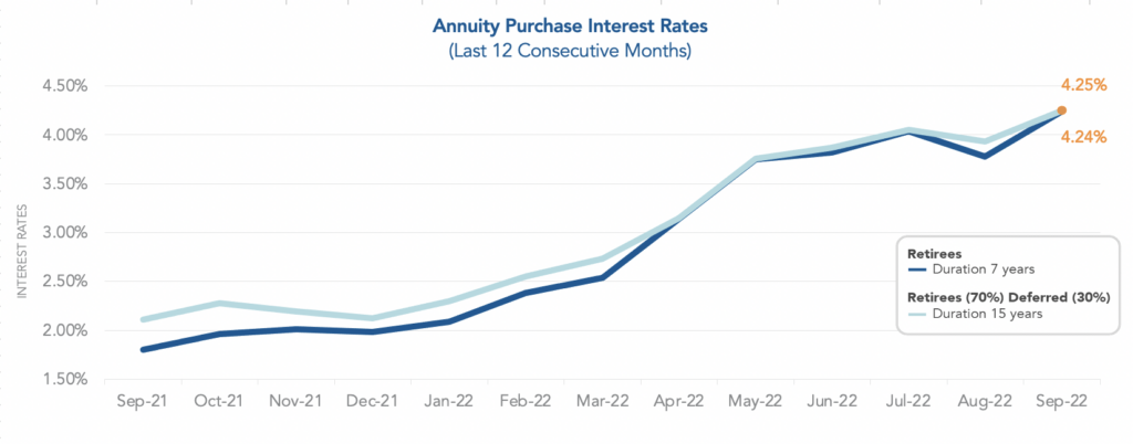 • The average Annuity Purchase Interest rates jumped this past month, with the average duration 7 rate at 4.24% and average duration 15 rate at 4.25%.