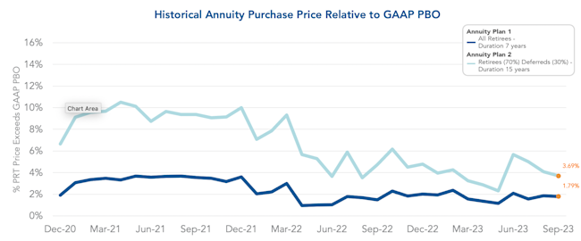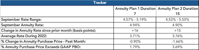 The graph below shows the spread between annuity purchase price above GAAP projected benefit obligation (PBO). We refer to GAAP PBO and accounting book value interchangeably. In September, we observed the spread between annuity purchase price above GAAP PBO for both plans narrow. For Annuity Plan 1, the spread decreased to 1.79% and Annuity Plan 2 experienced a dip to 3.69%. The current spread for both hypothetical plans are lower than the historical averages - 2.37% for Annuity Plan 1 and 6.6% for Annuity Plan 2. An increase in annuity purchase rates inversely lowers annuity purchase prices relative to accounting book value. Please note that the below PBO calculations exclude future overhead costs paid by plan sponsors to retain participants in the plan. Administrative expenses and PBGC premiums are examples of these overhead costs.