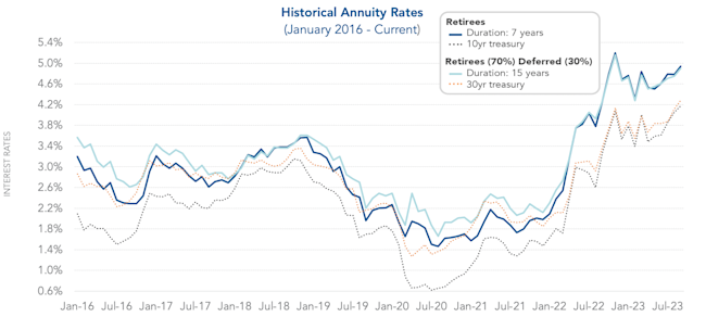 - Average annuity purchase interest rates reached an all time high for the year with the average duration 7 rate at 4.94% and average duration 15 rate at 4.90%.