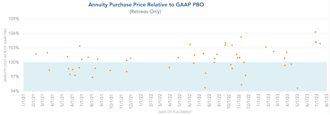 The graph below represents the annuity purchase price relative to GAAP projected benefit obligation (PBO) of the retiree cases placed by October Three Annuity Services since 2021. As we continue into the second half of the year, we will continue to see more placements at October Three. Since 2021, annuity purchase cost for retirees was on average 100.48% of GAAP PBO at October Three. We observed a range of 94.65%-106.27% of GAAP PBO.The vast majority of market activity occurred in the third and fourth quarters. This year, insurers have experienced a consistent rush which they anticipate will remain as we approach the last quarter of the year.