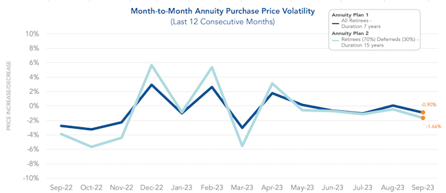 Annuity Purchase interest rates in 2023 have been less volatile than 2022. This month the annuity purchase price decreased for Annuity Plan 1 by .90% and 1.66% for Annuity Plan 2. Although the graph below shows a month to month fluctuation, annuity purchase interest rates are market dependent and actually fluctuate daily. To hedge against this short term volatility, a plan sponsor terminating their pension plan could settle the retiree portion of their liability to "lock in" favorable rates.