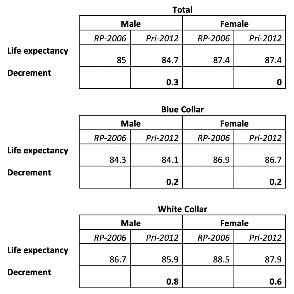 These new Pri-2012 tables (with a “central year” of 2012) also reflect shorter life expectancies than the earlier (RP-2006) tables, as follows: