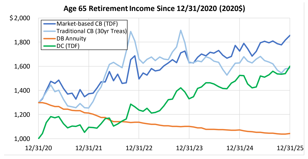 In our last two articles we have reviewed how much retirement income participants under the four basic retirement plan designs – DC/401(k), traditional (annuity based) DB, “traditional” (fixed interest rate credit) cash balance, and market-based cash balance – have been able to generate over the last five years. To do that, we tracked performance (in terms of “retirement income purchasing power”) over the period 2021-2025 under these plans, based on three critical financial risk factors: asset returns, interest rates (which drive the cost of retirement income, e.g., annuity purchase rates), and inflation.
