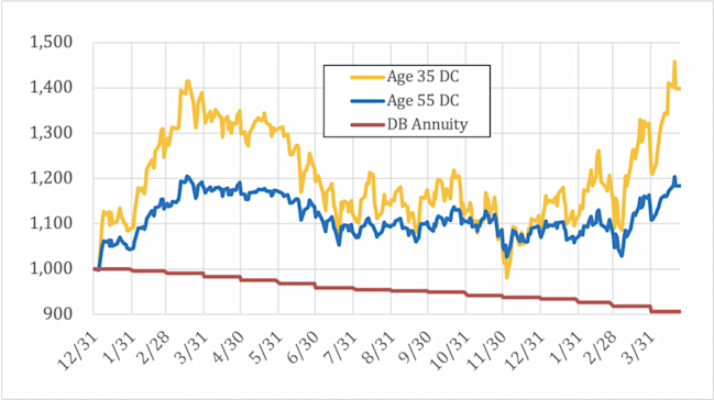 We track the projected age 65 retirement income of two example DC participants invested in a standard (age appropriate) target date fund. Each participant, as of the beginning of 2021, would have been able to buy a $1,000 per month annuity with her account balance. Here’s the chart through April 20, 2022, adjusted for inflation (these numbers are in “2020 dollars”), with the “performance” of a DB annuity included for comparison: