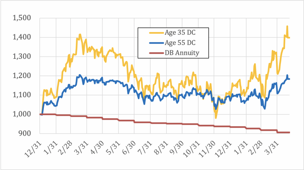 We track the projected age 65 retirement income of two example DC participants invested in a standard (age appropriate) target date fund. Each participant, as of the beginning of 2021, would have been able to buy a $1,000 per month annuity with her account balance. Here’s the chart through April 20, 2022, adjusted for inflation (these numbers are in “2020 dollars”), with the “performance” of a DB annuity included for comparison: