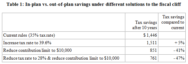 Table 1 summarizes the impact on the value of saving in a 401(k) plan to a high margin taxpayer/participant of three different solutions to the fiscal cliff: increasing the highest marginal tax rate to 39.6%; keeping the current rate (35%) but limiting annual 401(k) contributions to $10,000 (currently the limit is $17,000); or reducing the current rate to 28% and limiting annual 401(k) contribution to $10,000. “Tax savings” is the difference between how much money the taxpayer/participant has, after 10 years, if she saves $17,000 in a 401(k) plan or pays taxes on the $17,000 and saves the net amount outside a plan. (Our other assumptions are explained in detail below.)